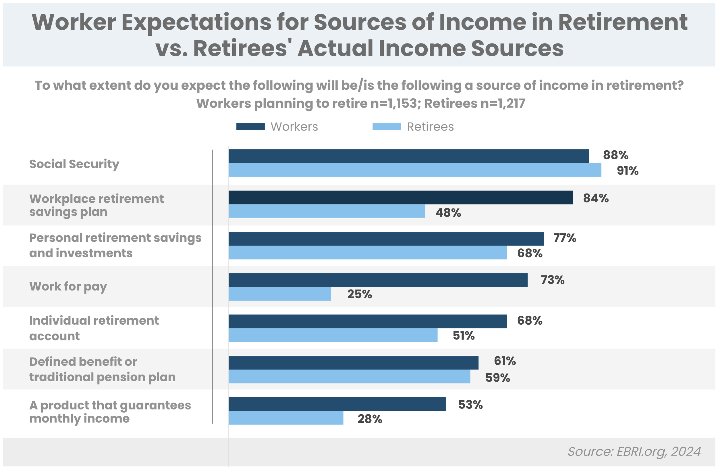 What workers anticipate in terms of retirement income sources may differ considerably from what retirees actually experience.